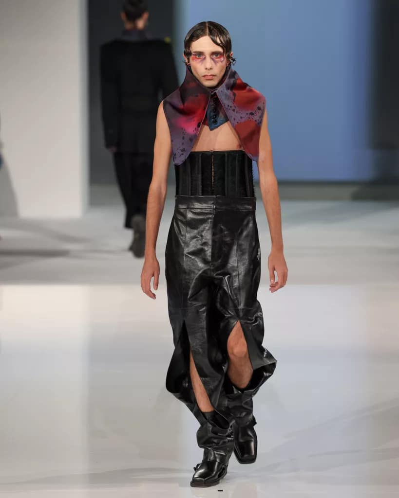 Garment construction features elements typically found in historical costuming and corsetry, such as splints and exaggerated cuts. These are used not only for aesthetic purposes but also to reinforce the collection’s narrative focus on physicality, performance and transformation. Deconstructed blazers, asymmetrical layering and modular silhouettes are recurring design motifs that reflect a flexible, adaptable identity.