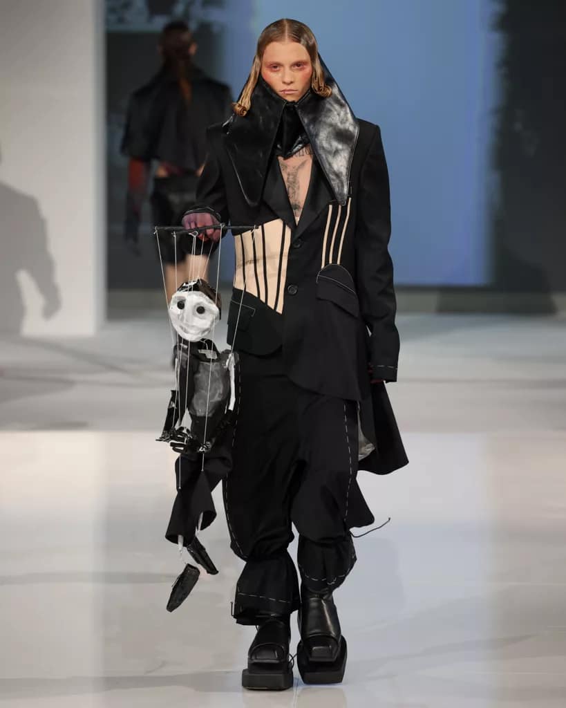 A key visual theme in the collection is the tension between control and freedom, interpreted through two contrasting influences: string puppets and classical ballet. Puppets, with their manipulated and often uncanny movements, represent themes of external control and the illusion of autonomy. In contrast, classical ballet conveys precision, fluidity and internal mastery of movement. These two influences are reflected in the structure and styling of the garments, which juxtapose rigid silhouettes with flowing fabrics, deconstructed tailoring with refined details.