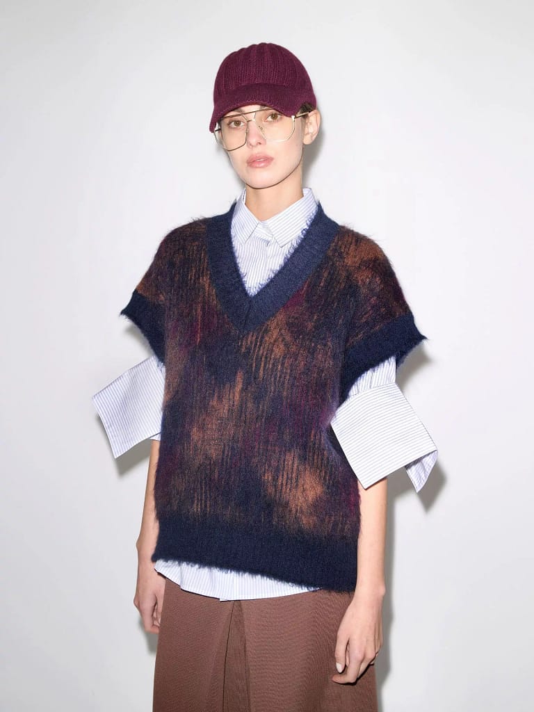 The garments are distinguished by unusual volumes, material contrasts and weaves that transform the classic into innovation. Oversize waistcoats and deconstructed cardigans with sculpted details are perfectly matched with formal shirts and check fabrics, creating a mix of elegance and casualness typical of college style.