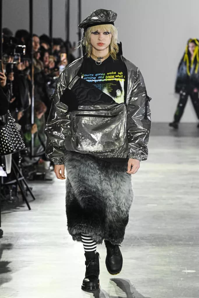 Sueyasu’s experiences in London also weave into his work, merging punk and rave elements into an array of bold designs. The collection showcases stark color contrasts, metallic finishes, and cyberpunk influences that mirror the vibrant energy of urban streets. Camouflage patterns are revitalized with bright, unexpected accents, highlighting the rebellious spirit that once characterized Harajuku.