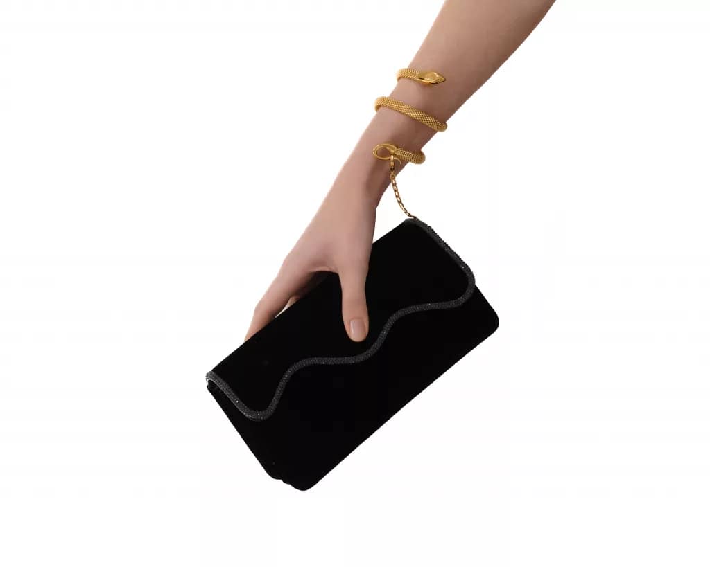 Extending its artistry beyond footwear, René Caovilla presents a capsule collection of mini bags designed to complement the season’s ensembles. The Bucket bag adorned with all-over rhinestones is available in black velvet and a shimmering orange and gold variant inspired by winter sunsets. The Wave clutch, offered in powdery satin, total black rhinestones or velvet with jet-black crystal trim features a Serpent bracelet handle, blending functionality with elegance. The Cocktail Bag, an all-black rhinestone piece with a jeweled snake handle epitomizes sophistication for glamorous occasions.