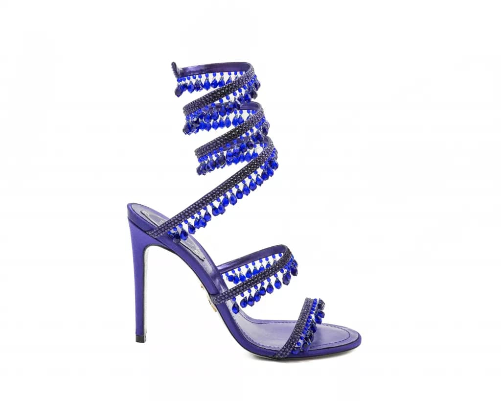 This season marks the debut of the Spark model, an evolution of the brand’s emblematic serpent theme. Crafted from luminous crystal baguettes, the Spark coils around the ankle in a radiant spiral, gracing sandals, thigh-high cuissardes and ankle boots. Available in vibrant hues like purple, orange, metallic gray, deep blue, raspberry and purple velvet, as well as sleek black stretch nappa leather, the Spark exemplifies the brand’s innovative spirit.